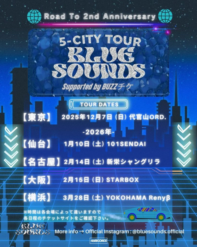 注目のライブムーブメント「BLUE SOUNDS」が、2025年12月より初の全国ツアー『BLUE SOUNDS 5-CITY TOUR Supported by BUZZチケ』を開催する。これまで関東を拠点に15公演以上を実施し、音楽メディア『movement press』では「今、必見のライブイベント10選」に選出。S席チケットが毎回数分で完売するなど、熱心な音楽ファンの支持を集めてきた。今回のツアーは、成長を続けるBLUE SOUNDSにとって初の全国展開となる。
