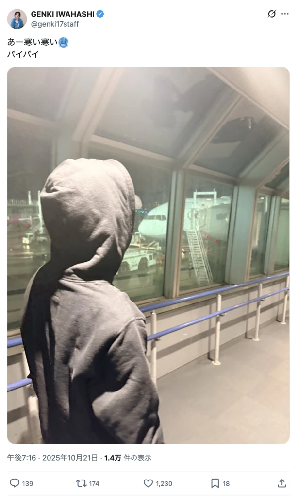 岩橋玄樹「あー寒い寒い」飛行機搭乗ショット公開しファン「どこ行くの?」