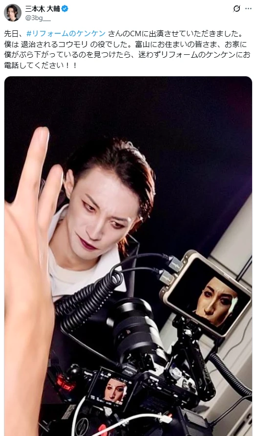「先日、#リフォームのケンケン さんのCMに出演させていただきました。僕は 退治されるコウモリ の役でした。富山にお住まいの皆さま、お家に僕がぶら下がっているのを見つけたら、迷わずリフォームのケンケンにお電話してください!!」
