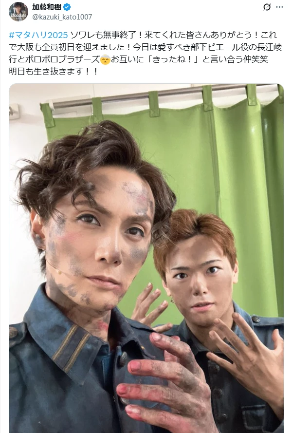 俳優でアーティストの加藤和樹が、現在出演中のミュージカル「マタ・ハリ」のオフショットを投稿。