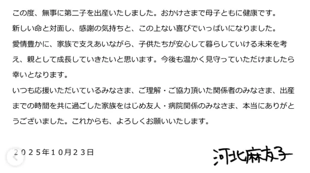 また、直筆署名入りの文書も公開し、「この度、無事に第二子を出産いたしました。おかげさまで母子ともに健康です。」と状況を伝えた。さらに「新しい命と対面し、感謝の気持ちと、この上ない喜びでいっぱいになりました。」と、現在の心境を綴っている。
