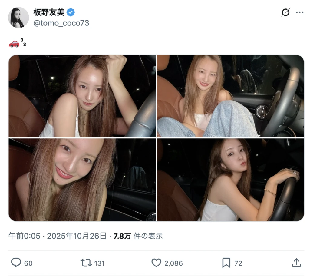 元AKB48でタレント・板野友美が26日、Xを更新。