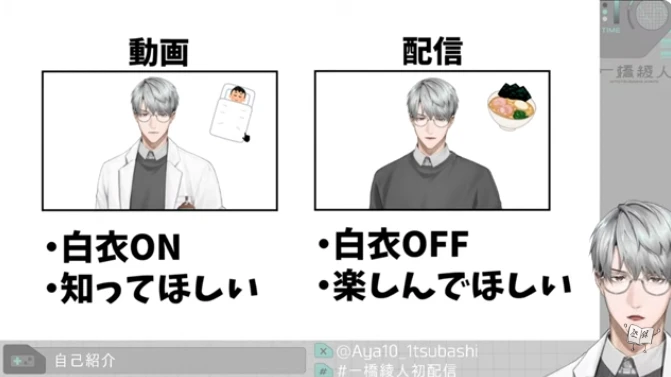 動画では基本的に白衣を着用し、精神科医としての知識を視聴者に届けたいという思いを込めて配信している。一方で、白衣を着ていない配信では、純粋に楽しんでもらうことを目的としている。