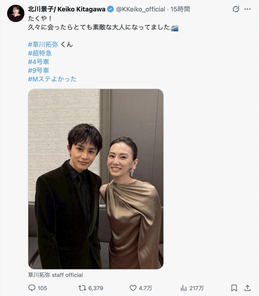 「たくや!久々に会ったらとても素敵な大人になってました🚄#草川拓弥 くん #超特急#4号車#9号車#Mステよかった」とつづり、同くスターダストプロモーションに所属の9人組メインダンサー&バックボーカルグループ超特急・草川拓弥との2ショットを公開。