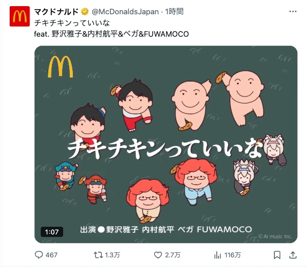 マクドナルドが新商品「チキチキン」の発売にあわせ、異色のコラボPRソング「チキチキンっていいな feat. 野沢雅子&内村航平&ベガ&FUWAMOCO」を公開。日本昔ばなしの名曲「にんげんっていいな」をオマージュしたユニークな動画が、SNSで注目を集めている。