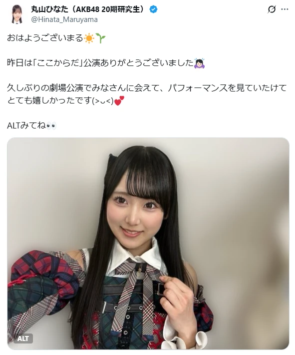 AKB48 20期研究生の丸山ひなたが、久しぶりの劇場公演に登壇し、ファンへの感謝を綴った。