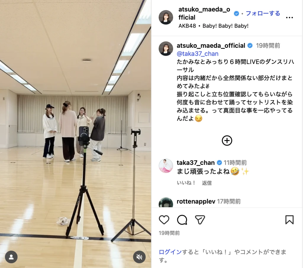 「内容は内緒だから全然関係ない部分だけまとめてみたよ✌︎振り起こしと立ち位置確認してもらいながら何度も音に合わせて踊ってセットリストを染み込ませる。って真面目な事を一応やってるんだよ😏」と裏側話とともにダンスリハーサルの様子を撮影した動画を公開した。