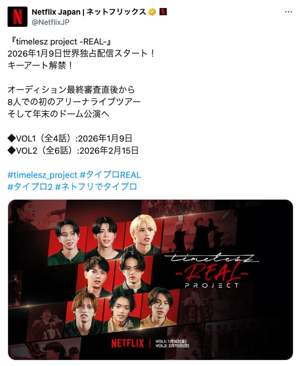 timeleszの新ドキュメンタリー「timelesz project -REAL-」がNetflixで独占配信決定。