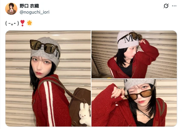 野口衣織がグレーのビーニーを合わせたY2Kスタイルの写真をSNSで公開。普段の衣装とは異なるカジュアルな雰囲気に、「可愛すぎる」といったコメントが相次ぎ、ファンの心を射抜いた。