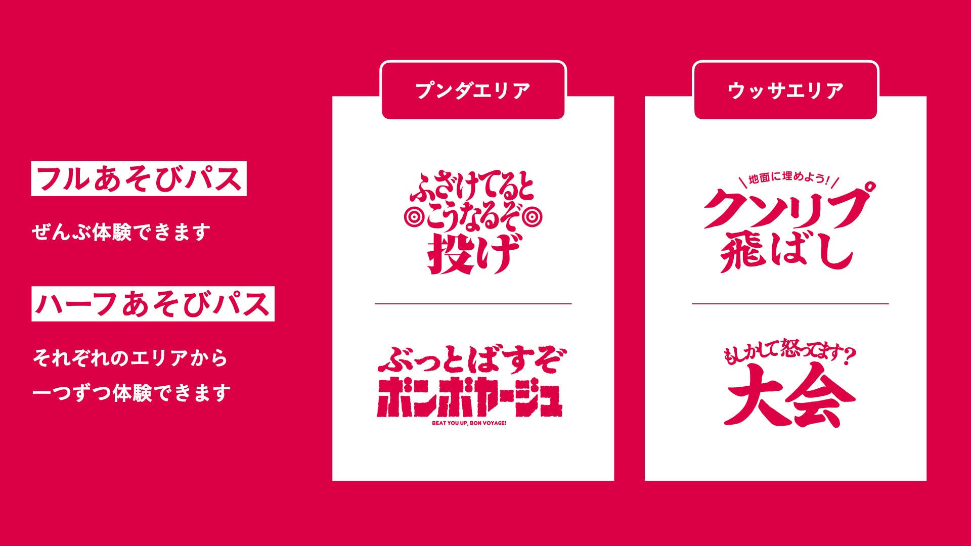 その他、あそびパスご購入の方は『地面に埋めよう!クソリプ飛ばし』『ぶっとばすぞボンボヤージュ』『ふざけてるとこうなるぞ投げ』『もしかして怒ってます?大会』などのコンテンツもお楽しみ頂けます。