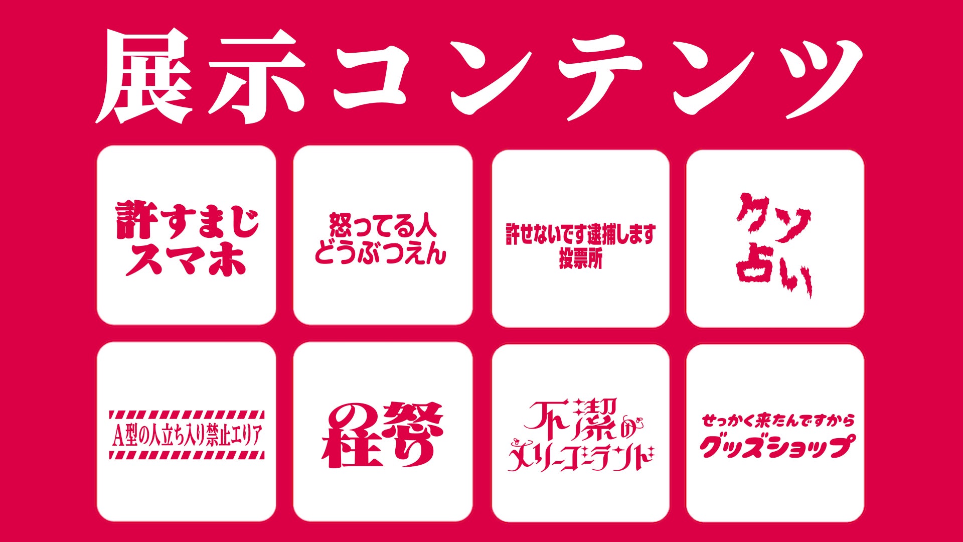 『怒怒怒ランド』は、「怒りを楽しむ体験型の展示会」です。『許すまじスマホ』『不潔のメリーゴーランド』『怒ってる人どうぶつえん』『A型の人立ち入り禁止エリア』『許せないです逮捕します投票所』等の「展示コンテンツ」が展示鑑賞券でお楽しみ頂けます。