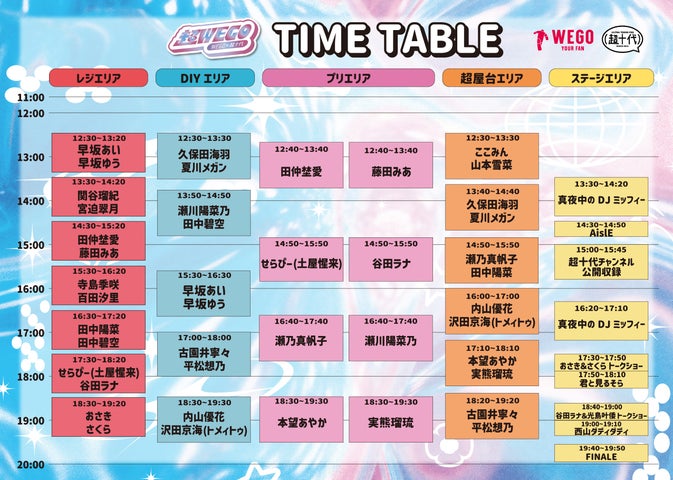 『超WEGO 2025』は、前回も大好評だった「スペシャルレジエリア」「プリエリア」「DIYエリア」「超屋台エリア」「ステージエリア」「フォトスポット&メッセージボードエリア」などに加え、新たに、サビだけを気持ちよく歌えるJOYSOUNDの新サービス[サビカラ]を体験できる 「カラオケエリア」や、青春ストリートスナップ【そら】さんの来場者SNAP撮影が登場。総勢30名以上の出演者たちと1日中WEGOで遊び尽くすことができる体験型店頭フェスとなっている。
