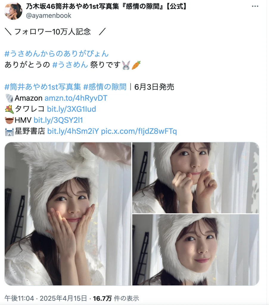 『乃木坂46筒井あやめ 1st写真集 感情の隙間』の公式アカウントのフォロワーが、15日に10万人を突破した。